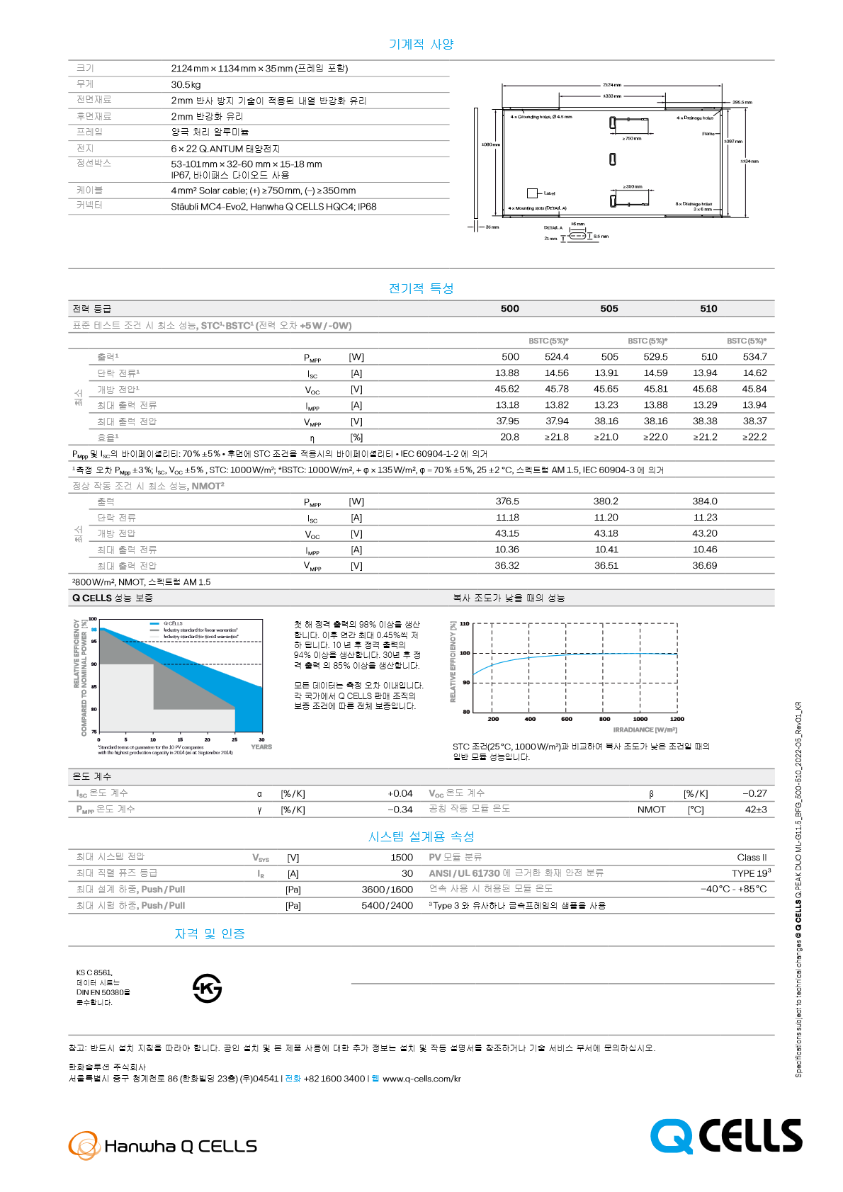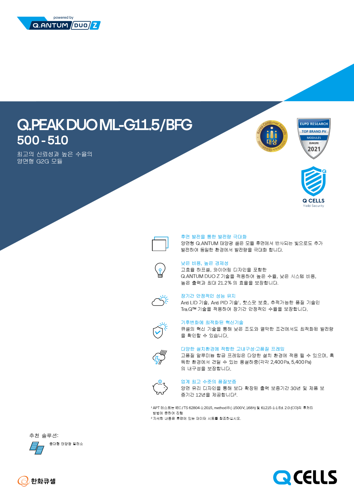 [한화솔루션] Q.PEAK DUO ML-G11.5/BFG KJ1, 510W (양면) 2등급