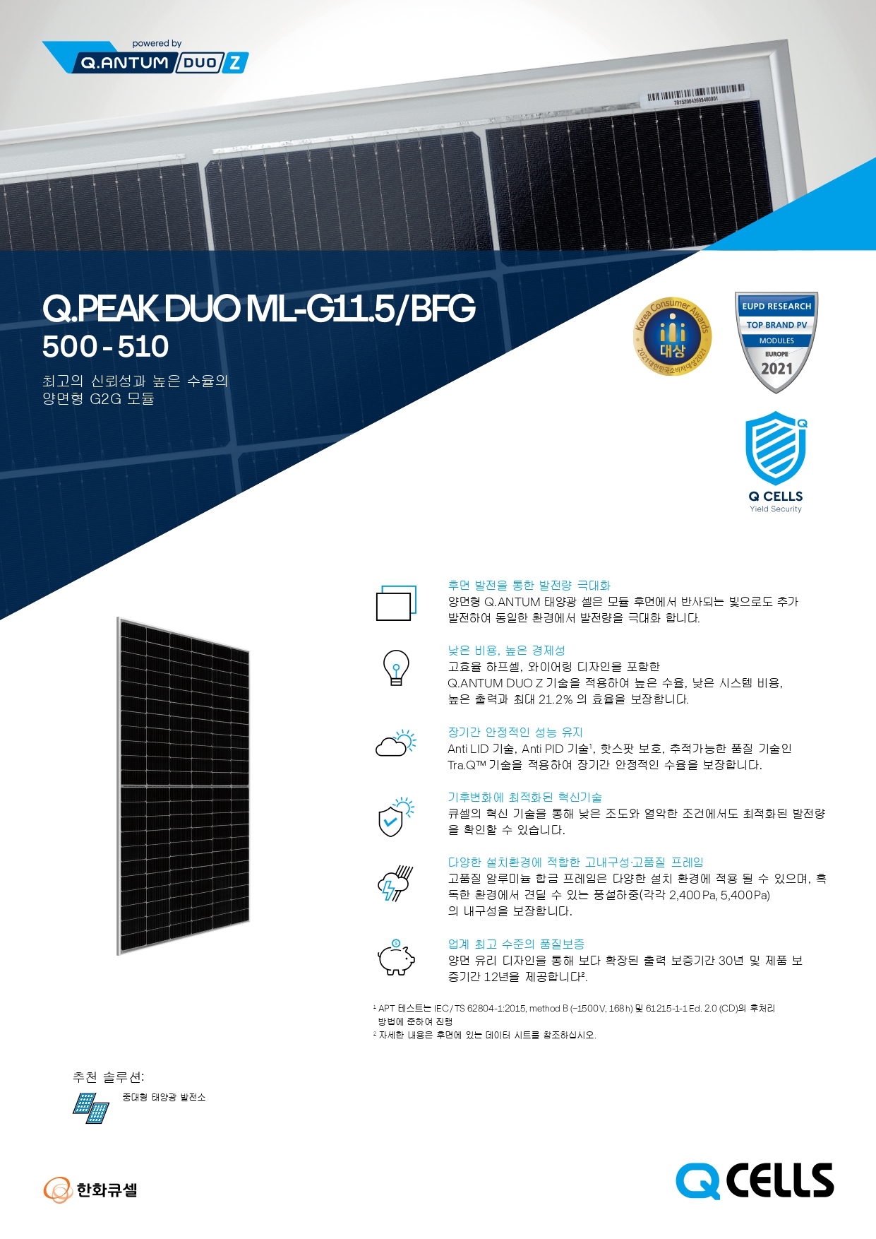 [한화솔루션] Q.PEAK DUO ML-G11.5 BFG KJ1 태양광 모듈 | 510W | 2등급