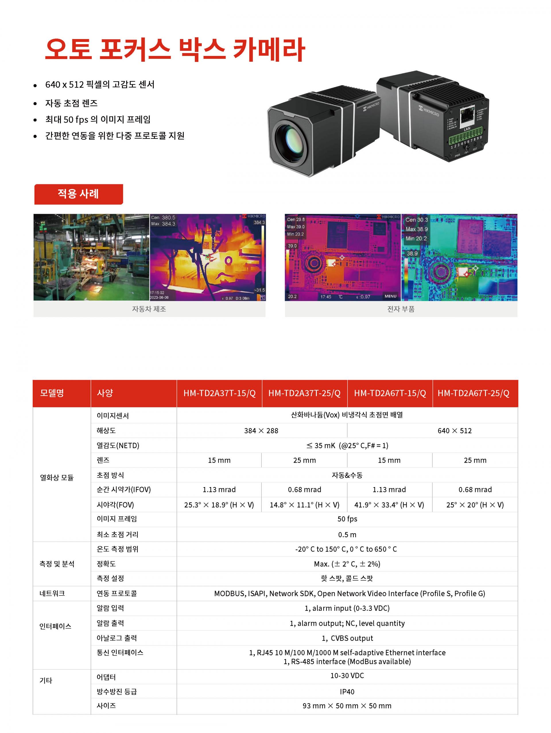 640x512, 15 mm, autofocus, 41.9°×33.4°, 50fps, -20~550℃, ±2℃/±2%, Modbus TCP/RS485, AlarmI/O, Power in DC 12V